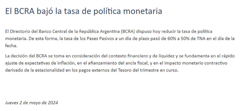 El Banco Central (BCRA) redujo la tasa de política monetaria de 60% a 50%, lo cual implica una nueva disminución de los rendimientos de los plazos fijos. La política económica que impulsa el ministro Toto Caputo y el presidente Javier Milei incluye continuar la baja de la tasa de los Pases Pasivos para "sanear" el BCRA y concretar la dolarización.