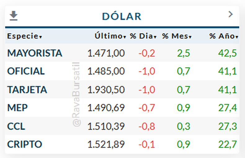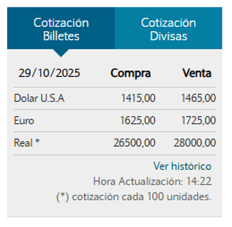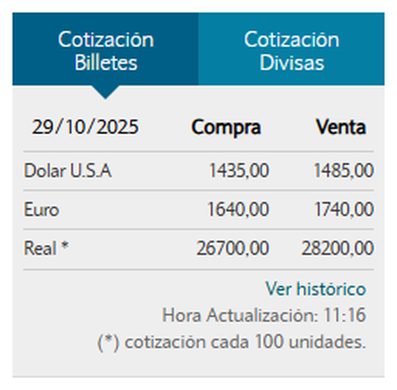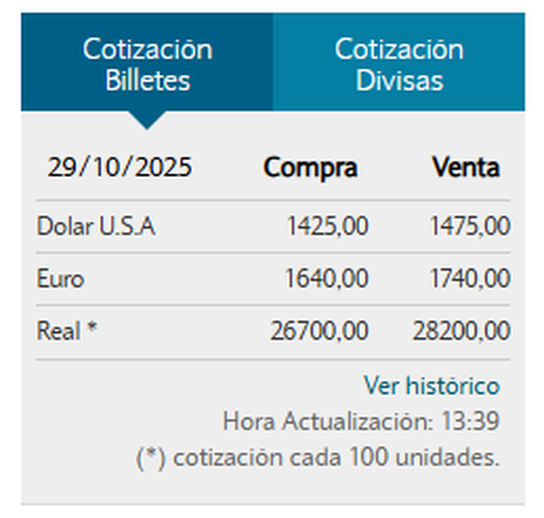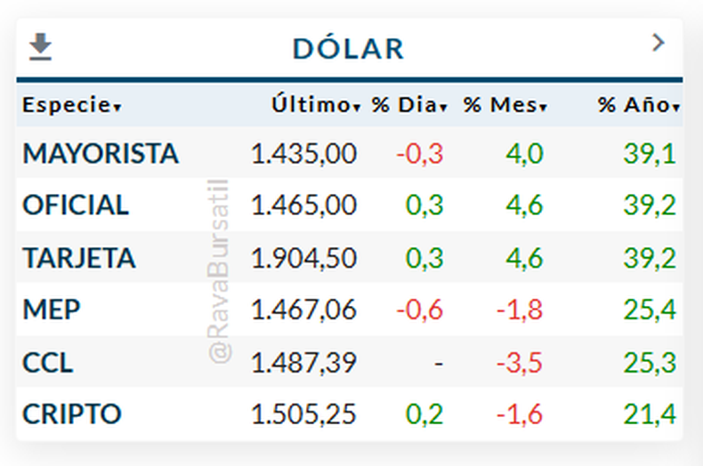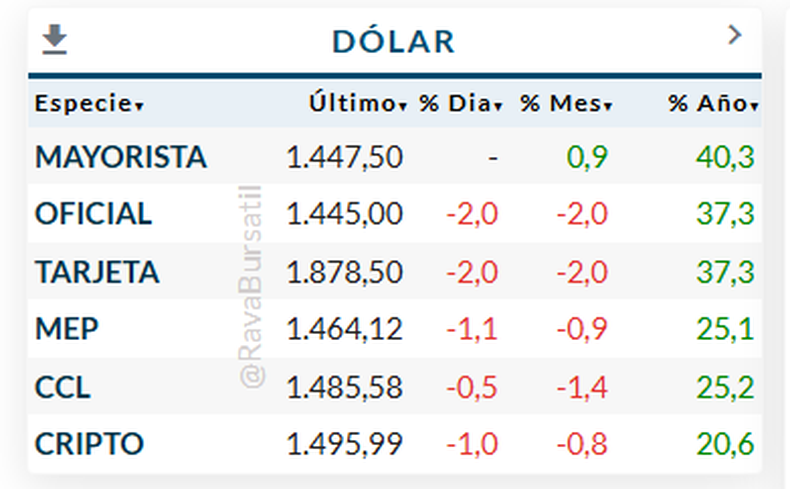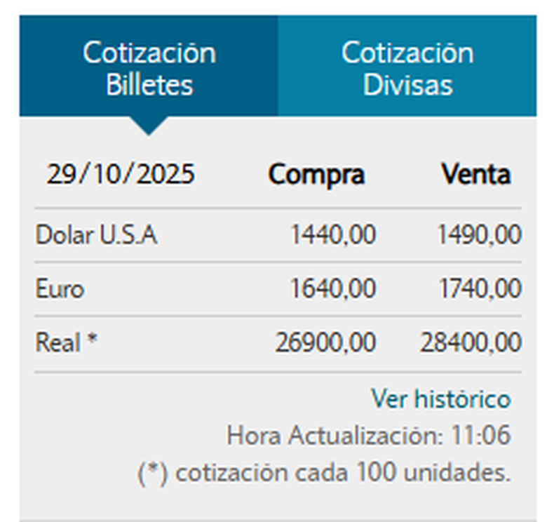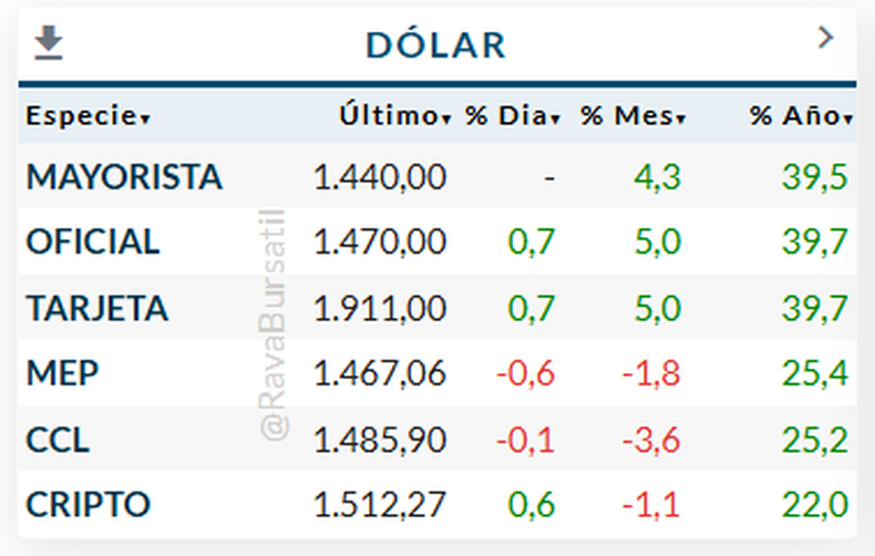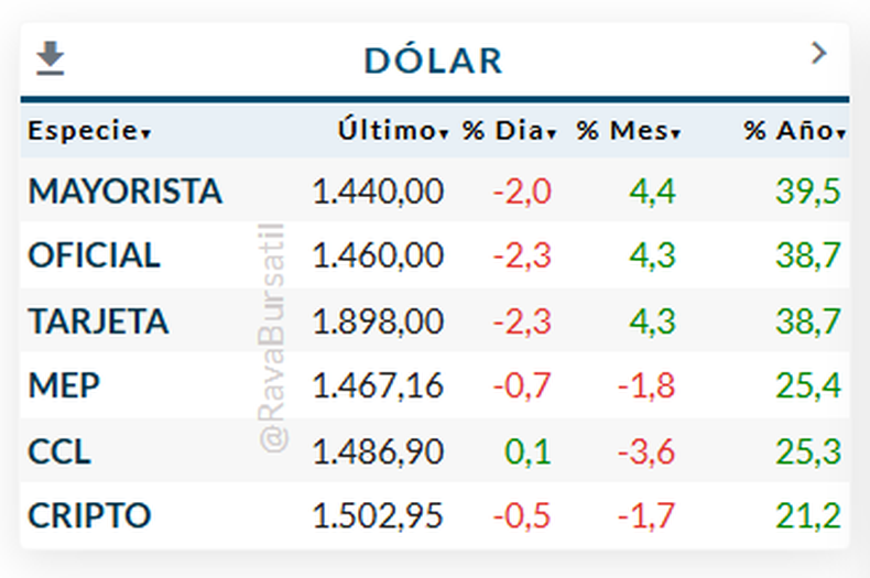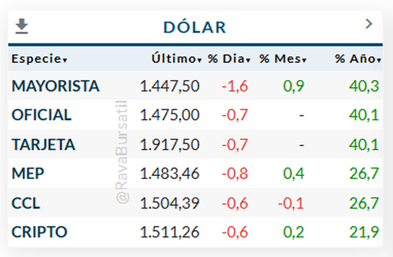 El dólar oficial y el dólar mayorista cotizan sin variaciones respecto del último cierre a $ 1.445 y $ 1.447,50, respectivamente. El techo de la banda está determinado por el Banco Central en $ 1.500,99 para este lunes.