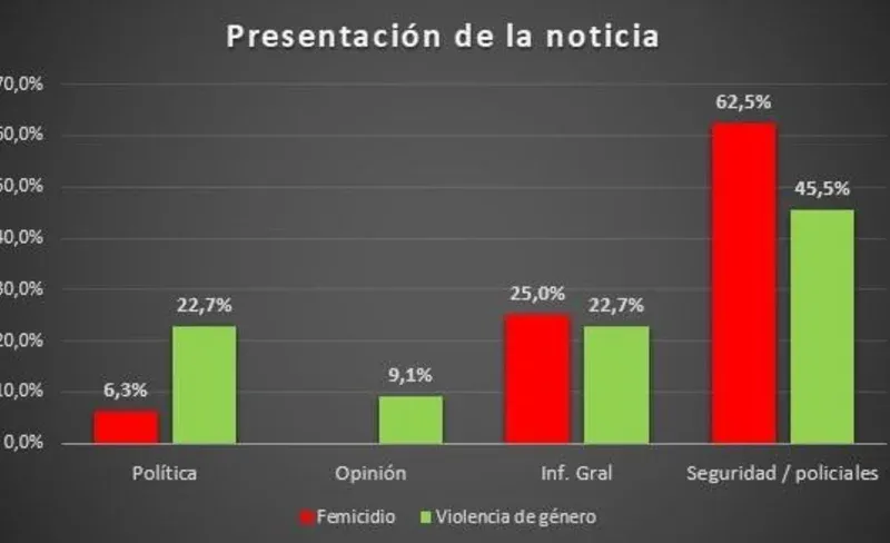 Si se analizan las fuentes consultadas en las noticias sobre género, la voz dominante es la del Poder Judicial (23,8%), aunque, tal como sucede en los policiales, también se destaca la de las fuerzas de seguridad (7,9%). Es decir, la definición del problema queda mayoritariamente en manos de los mismos poderes públicos que revictimizan a las mujeres a la hora de tomar una denuncia o enjuiciar a un agresor. Sirva de ejemplo el femicidio de la adolescente de 16 años Lucía Pérez, sobre el que el Tribunal Oral Criminal N° 1 de Mar del Plata evidenció su aberrante carencia de perspectiva de género al sentenciar que la muerte de la menor estuvo sólo asociada al consumo de drogas. Ni el empalamiento incluido en la causa por la fiscal fue suficiente para que los anteojos de “la justicia” aparecieran tan opacos al acontecer social que transitamos.