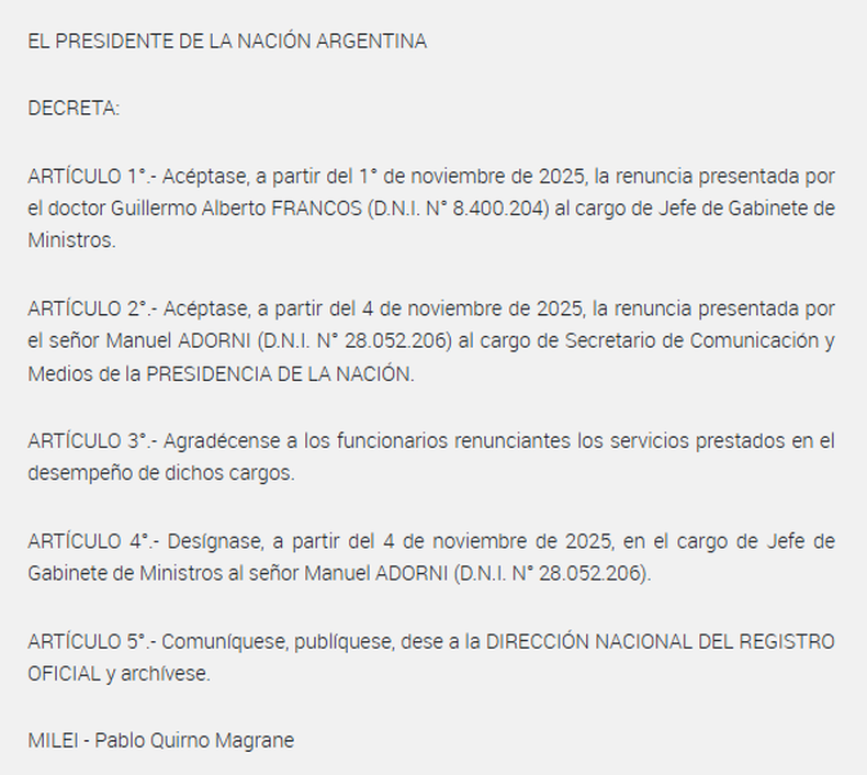 El gobierno de Javier Milei ratificó su rumbo con la victoria en las elecciones legislativas del 26 de octubre y el peronismo intensificó sus internas a partir de la derrota. En esta nota, el minuto a minuto de las decisiones del Presidente y el pase de facturas de la oposición.