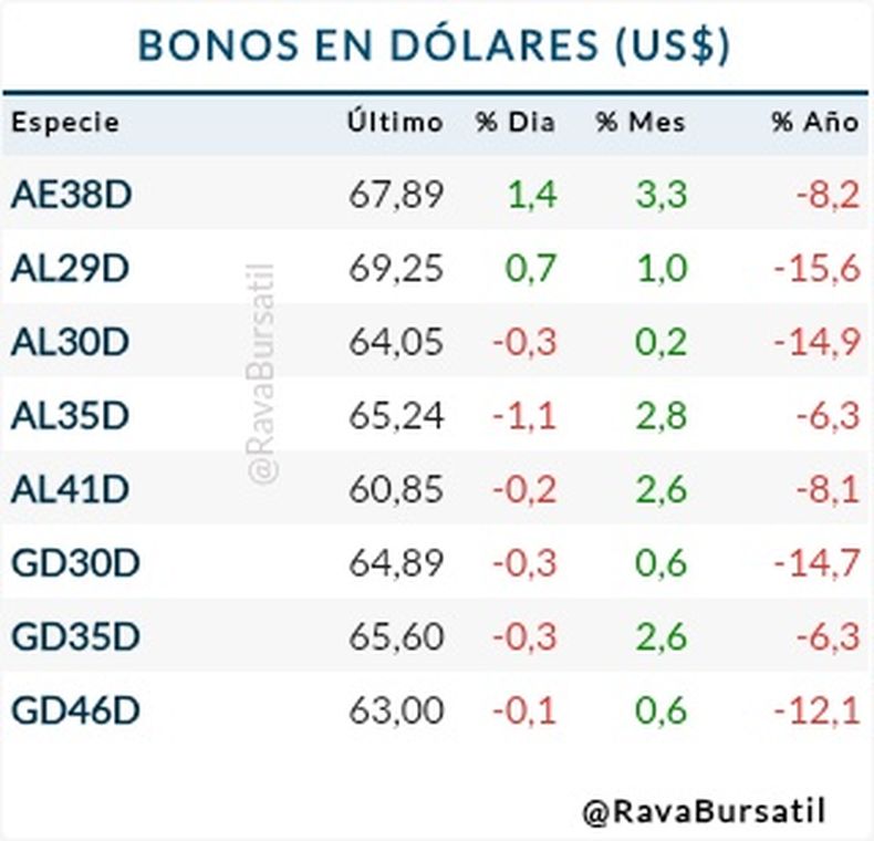 Además, los bonos argentinos en dólares que operan en Wall Street cayeron hasta 2,5%, liderados por el Bonar 2038, seguido por el Bonar 2041 (-1,6%), y el Bonar 2035 (-1,3%). Como consecuencia, el riesgo país que mide el J.P. Morgan escaló 4,5% hasta los 784 puntos básicos.